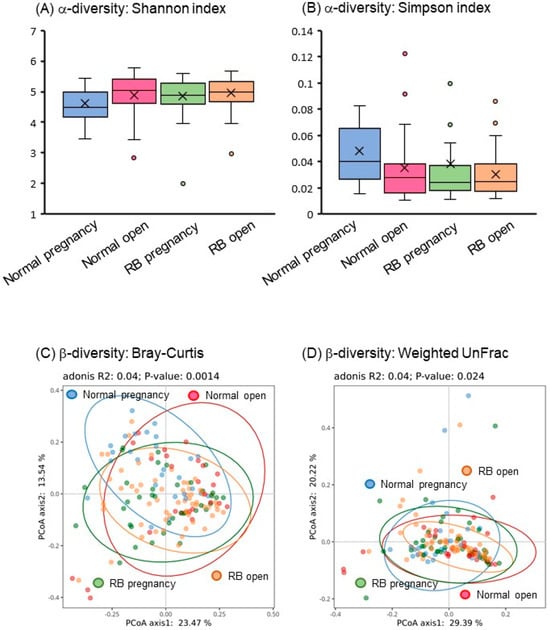 Gut microbial diversity in Holstein cows. (A,B) Shannon and Simpson indexes as α-diversity of the fecal bacteriome of Holstein cows. (C,D) Bray–Curtis and weighted UniFrac analyses as β-diversity of the fecal bacteriome of Holstein cows. Blue-lined circle represents individuals in Normal pregnancy group. Red-lined circle represents individuals in Normal open group. Green-lined circle represents individuals in RB pregnancy group. Orange-lined circle represents individuals in RB open group.