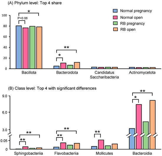At the class level, the top three predominant bacteria in the feces of cows in the four groups were Clostrida (73–76%), unclassified (8.8–9.3%), and Bacteroidia (3.6–8.5%). We selected the top four significantly (p < 0.05) altered bacteria and the bacteria of classes Sphingobacteriia, Flavobacteriia, and Bacteroidia were found to be significantly (p < 0.05) enriched in the gut microbiota of cows in both open groups (Normal and RB) compared to the Normal pregnancy group (Figure 3B). Bacteria of the class Mollicutes were also present at higher levels in the Normal open group than in the Normal pregnancy group (Figure 3B).