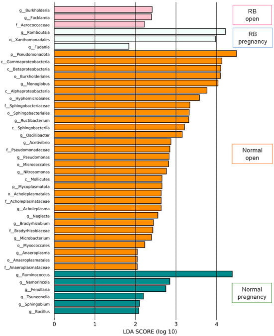 We listed the genus-level bacteria that varied in the open groups, both Normal and RB, compared with the Normal pregnancy group (Supplementary Table S1). Bacteria identified as common variants in the LEfSe analysis (Figure 5) were similarly listed. In contrast, bacteria that showed significant variations when compared with the RB open group were also listed. For example, bacteria of the genus Streptococcus and Terrisporobacter showed a significant increase in abundance in the RB open group only when comparing the RB open with Normal pregnancy group, which was different from the change observed when the Normal open and Normal pregnancy groups were compared (p < 0.05).