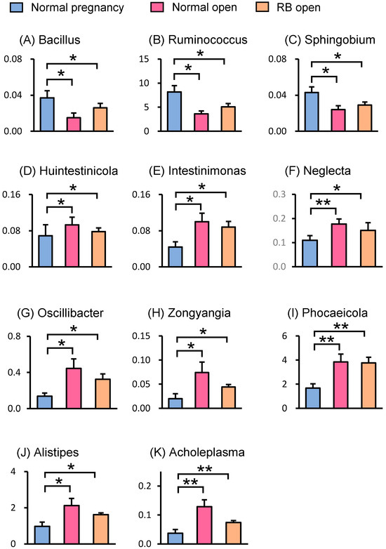 Relative abundances of genus-level bacteria in the feces of Holstein cows. Relative abundances of genus-level bacteria in the feces from LEfSe analysis are shown. (A–C) Three genera of bacteria were identified as characteristic bacteria that were more abundant in the Normal pregnancy group compared to the both open groups (Normal and RB). (D–K) Eight genera of bacteria were identified as characteristic bacteria that were less abundant in the Normal pregnancy group compared to those in the both open groups (Normal and RB). Data are presented as the mean ± SEM. Asterisks indicate significant differences between the group (* p < 0.05, ** p < 0.01).