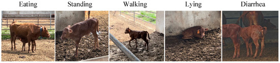 The dataset utilized in this paper to recognize Jinnan calf diarrhea behavior was collected from a farm located in Yongji, Shanxi Province. The farm is 100 m long and 24 m wide, containing approximately 45 Jinnan calves. These calves were up to six months old. To achieve comprehensive real-time monitoring of Jinnan calf diarrhea behavior, cameras were installed 2.5 m above the four corners of each pen. Four cameras were deployed at 45°, 135°, −45°, and −135°. To obtain the recognition dataset of Jinnan calf diarrhea behavior, a total of 3606 videos of Jinnan calf diarrhea behavior were collected over a one-month period. The video collection period spanned from 0:00 to 24:00 across diverse weather conditions (sunny/cloudy/rainy = 6:3:1), capturing comprehensive variations including different postures, orientations, lighting conditions, and backgrounds. Subsequently, each video was evenly divided at a rate of 25 frames per second, and the strategy of random frame extraction was adopted to construct the dataset. The dataset covers five different diarrhea-related behaviors of Jinnan calves, including eating, walking, standing, lying, and diarrhea. The behavior categories along with their corresponding descriptions and labels in the dataset are presented in Table 1.