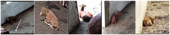 Regarding the number of video samples for these five behavioral categories, the number of samples for the eating behavior is 722, for the standing behavior is 727, for the walking behavior is 730, for the lying behavior is 727, and for the diarrhea behavior is 700. The detailed distribution of video samples across these five behavioral categories is summarized in Table 2. The dataset was randomly split into a training set and a test set in an 8:2 ratio. Specifically, the training set comprised 44,772 images, and the test set contained 9594 images. All images were uniformly resized to 224 × 224 pixels. Figure 1 presents several samples from the Jinnan calf diarrhea behavior recognition dataset. Figure 2 provides a visual comparison of the same behavior (such as lying) exhibited by different calves under different conditions.
