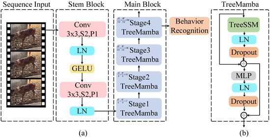 Deep learning has revolutionized video behavior recognition. Convolutional Neural Networks (CNNs) [21] became the established standard for spatial feature extraction. To model temporal information, architectures like C3D, Two-Stream Networks, and ConvLSTM [10] were developed. Vision Transformers (ViTs) [22] and Pyramid Vision Transformers (PVTs) [23] have shown strong performance by leveraging self-attention mechanisms to capture global contexts. Most recently, state space models (SSMs), particularly the Mamba architecture [20,24], have emerged as a promising alternative for long-sequence modeling due to their linear time complexity and effective dependency capture. However, two pivotal challenges persist: (1) Long-sequence modeling efficiency: While effective, many existing models suffer from quadratic computational complexity or memory constraints, limiting their efficiency in processing long video sequences crucial for understanding behavioral context. (2) Discrimination of subtle inter-class differences: Despite their power, capturing fine-grained spatial details and long-range pixel dependencies necessary to differentiate behaviors with high visual similarity remains a challenge. Our proposed S_T_Mamba model, integrating a sequence processing strategy and a novel TreeSSM, is designed specifically to address these two limitations.