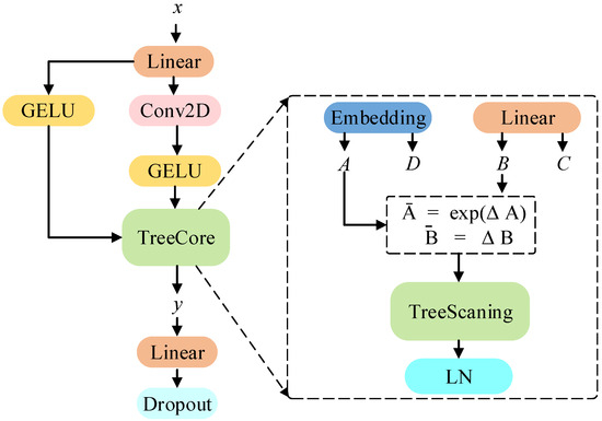 To enhance the performance of Jinnan calf diarrhea behavior recognition, we developed an efficient model called S_T_Mamba, as illustrated in Figure 3. It mainly consists of an input component that employs a sequence processing strategy, a stem block, and several TreeMamba blocks. The core module of TreeMamba is a tree state space module.