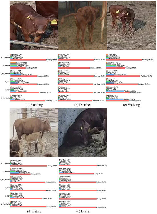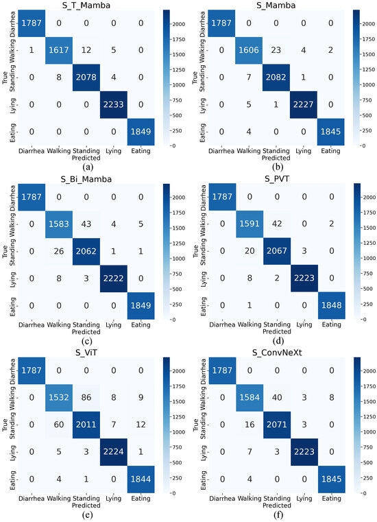 As shown in Figure 7, it presents the recognition results of various models for different behaviors. For the standing behavior depicted in Figure 7a, compared to the accuracies of the S_Mamba, S_Bi_Mamba, S_PVT, S_ViT, and S_ConvNeXt models, which are 36.4%, 62.7%, 62.8%, 68.9%, and 83.1%, respectively, our model demonstrates superior performance, achieving an accuracy of 84.3%. Additionally, as illustrated in Figure 7b,d,e, for the behaviors of diarrhea, eating, and lying, our method attains accuracies of 94.9%, 94.1%, and 91.7% respectively. Finally, regarding the “Walking” behavior, as shown in Figure 7c, due to the high visual similarity between the “Walking” and “Standing” behaviors, recognizing the “Walking” behavior presents a significant challenge. Our proposed S_T_Mamba model effectively addresses this challenge and achieves a high accuracy of 81.9% in correctly identifying the “Walking” behavior. In contrast, the S_ViT model achieves accuracies of 40.8% for “Walking” and 53.3% for “Standing”, while the S_ConvNeXt model attains accuracies of 39.0% for “Walking” and 51.9% for “Standing”. This indicates that S_ViT and S_ConvNeXt experience relatively serious confusion issues during the recognition process. Based on the above analysis, the superior performance of the S_T_Mamba model in accurately recognizing calf diarrhea behaviors has been validated.