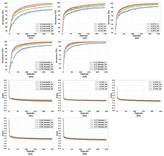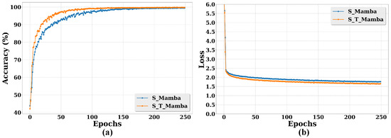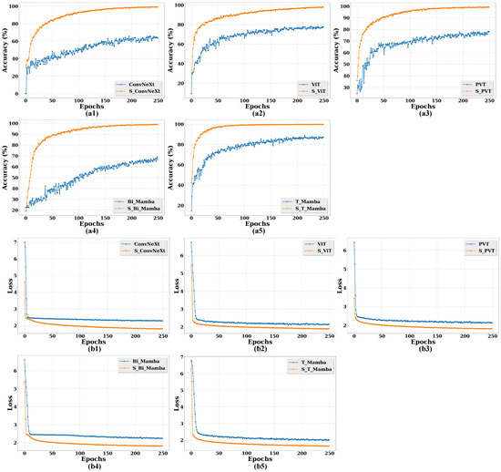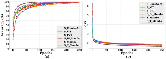 Figure 6a demonstrates that the accuracy of S_T_Mamba consistently surpasses that of the S_ConvNeXt, S_ViT, S_PVT, S_Bi_Mamba, and S_Mamba models. Furthermore, as shown in Figure 6b, the S_T_Mamba model attains the lowest loss value. These results further validate the effectiveness of S_T_Mamba.
