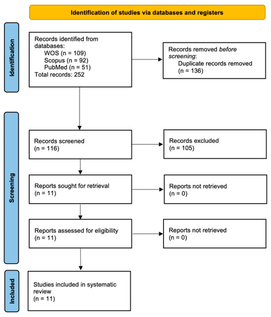 During the search for scientific articles, initially 252 documents were found (WOS, 109 records; SCOPUS, 92 records; and PubMed, 51 records), of which 136 articles were duplicated for an initial screening of 116 registers. Subsequently, through the analysis of the title, abstract, and keywords, 105 articles were excluded, for a total of 11 scientific articles that met the inclusion criteria [36,37,38,39,40,41,42,43] (Figure 1).