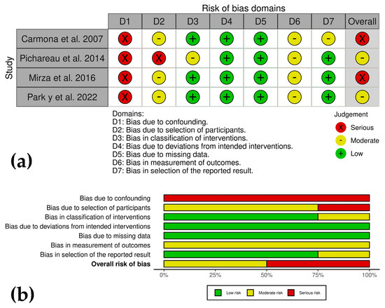 The CSs analyzed using the risk of bias in non-randomized studies of interventions (ROBINS-I) tool demonstrate varying levels of bias, with common limitations including small sample sizes, lack of randomization and blinding, and reliance on subjective outcomes [36,37,38,40]. While some studies show moderate risk due to objective measures supporting findings, others exhibit serious risks due to confounding and selection biases. Across all studies, the absence of control groups and unblinded assessments reduces reliability (Figure 2a,b). For instance, Mirza et al. [38] and Park et al. [40] highlight the importance of objective measures but call for further controlled studies. Similarly, Pichereau et al. [37] and Carmona et al. [36] underscore the preliminary nature of their findings and recommend larger, more rigorous trials.