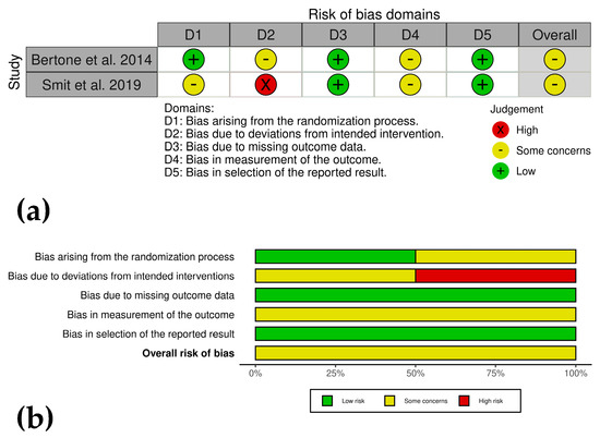 The clinical studies (analyzed using the RoB2.0 framework) by Bertone et al. [44] and Smit et al. [39] exhibited some concerns regarding risk of bias, primarily due to lack of blinding, and subjective outcome measures. Both studies demonstrated strengths in complete data reporting and objective outcome measures. However, the absence of detailed randomization and blinding raised concerns about potential bias (Figure 3a,b).