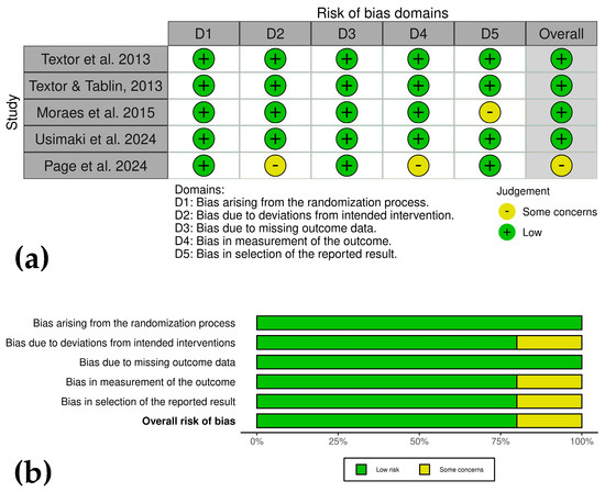 The analysis showed variable risk of bias across studies. Textor et al. [41], Textor and Tablin [42], and Usimaki et al. [46] demonstrated low risk in all domains. Moraes et al. [43] showed low risk but raised concerns about reported result selection, while Page et al. [45] exhibited some concerns due to deviations from interventions and outcome measurement. Strengths included robust randomization, minimal missing data, and objective measures like force plate analysis (Figure 4a,b).