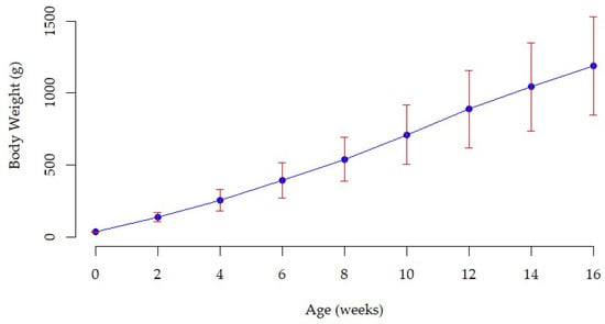 Figure 1. Body weight growth pattern of indigenous Tilili chickens measured from hatch to 16 weeks of age. The vertical bars (red) indicate the standard deviations.