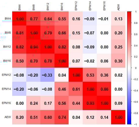 Figure 2. Genetic (below diagonal) and phenotypic correlation (above diagonal) of growth and egg production traits of Tilili chicken under intensive management system. BW4—body weight at 4 week, BW8—body weight at 8 week, BW12—body weight at 12 week, BW16—body weight at 16 week of age, EPM12—egg numbers in month 1 to 2, EPM14—egg numbers in month 1 to 4, EPM16—egg numbers in month 1 to 6, AEW—average egg weight.