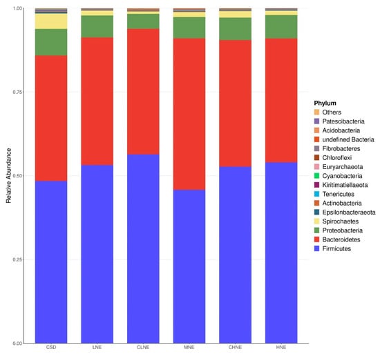 Colonic bacterial community structure on phylum level of 130 kg finishing pigs. CSD = 11.3%CP, 10.02 MJ/kg NE; LNE = 10.5%CP, 9.44 MJ/kg NE; CLNE = 10.5%CP, 9.73 MJ/kg NE; MNE = 10.5%CP, 10.02 MJ/kg NE; CHNE = 10.5%CP, 10.31 MJ/kg NE; HNE = 10.5%CP, 10.61 MJ/kg NE.