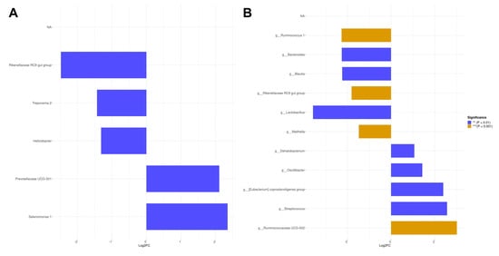Analysis of differential species of 130 kg finishing pigs. (A) Analysis of species differences between CSD and MNE; CSD = corn–soybean basal diet (11.3%CP, 10.02 MJ/kg NE); MNE = diversified diets (10.5%CP, 10.02 MJ/kg NE); (B) Analysis of species differences between LNE and HNE; LNE = diversified diets (10.5%CP, 9.44 MJ/kg NE); HNE = diversified diets (10.5%CP, 10.61 MJ/kg NE).