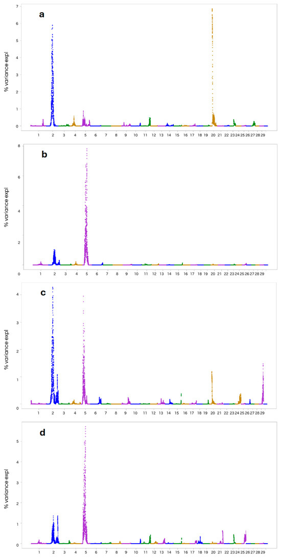 In GWAS models based on ssGBLUP it is common to present the percentage of additive genetic variance explained by the chromosome segment (generally 500 kb to 1 mb) instead of the level of significance of the association [13,56,57,58,59].