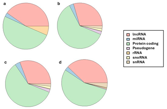 Of all the markers found, the majority (56.43%) corresponded to genes that generated coding proteins (Figure 2), 34.73% to lncRNA, and the remaining 8.83% were made up of other types of markers (miRNA, pseudogenes, rRNA, snoRNA and snRNA).