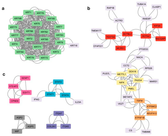 - Szklarczyk, D.; Gable, A.L.; Lyon, D.; Junge, A.; Wyder, S.; Huerta-Cepas, J.; Simonovic, M.; Doncheva, N.T.; Morris, J.H.; Bork, P.; et al. String v11: Protein-protein association networks with increased coverage, supporting functional discovery in genome-wide experimental datasets. Nucleic Acids Res. 2019, 47, D607–D613. [Google Scholar] [CrossRef] [PubMed]