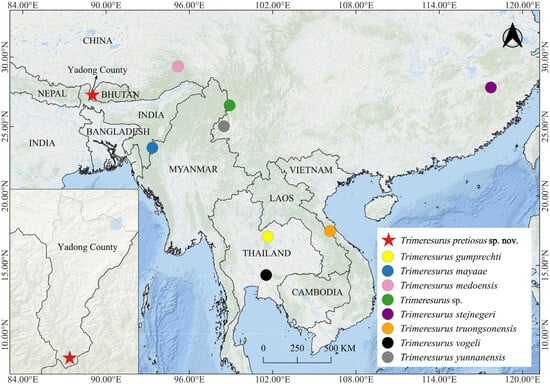 According to the classification proposed by Mirza et al. [1], the genus is currently divided into six subgenera: Trimeresurus s. str., Parias Gray, 1849, Popeia Malhotra and Thorpe, 2004, Himalayophis Malhotra and Thorpe, 2004, Sinovipera Guo and Wang, 2011, and Viridovipera Malhotra and Thorpe, 2002 (see also Idiiatullina et al. [5]; Pawangkhanant et al. [7]). Species placed within Viridovipera are defined by two key morphological features: the first supralabial scale is completely separated from the nasal scale, and the hemipenis is short and spinose [1,13]. Currently, seven nominal species are assigned to this subgenus, including Trimeresurus gumprechti David, Vogel, Pauwels and Vidal, 2002 [type locality: Phu Luang Wildlife Research Station, Loei Province, Thailand], T. mayaae Rathee, Purkayastha, Lalremsanga, Dalal, Biakzuala, Muansanga and Mirza, 2022 [type locality: Champhai District, Mizoram State, India], T. medoensis Zhao, 1977 [type locality: Motuo (Medog) County, Xizang Autonomous Region, China]; T. stejnegeri Schmidt, 1925 [type locality: Shaowu, Fujian Province, China]; T. truongsonensis Orlov, Ryabov, Bui and Ho, 2004 [type locality: Phong Nha-Ke Bang National Park, Quang Binh Province, Vietnam], T. vogeli David, Vidal and Pauwels, 2001 [type locality: Khao Yai National Park, Nakhon Ratchasima Province, Thailand]; and T. yunnanensis Schmidt, 1825 [type locality: Tengchong, Yunnan Province, China] [11,14].