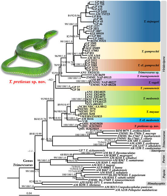 The discovery of Trimeresurus pretiosus sp. nov. constitutes an important addition to our knowledge on the taxonomy of the subgenus Viridovipera, as it represents the westernmost and most geographically isolated member of the group. Mitochondrial DNA genealogy indicates that the new species is a sister to the clade comprising T. mayaae, T. medoensis, and T. cf. medoensis. Although the new species is currently known only from Yadong County of Xizang AR of China, its occurrence near the People’s Republic of China’s national borders with Bhutan and India suggests that it may likely also inhabit the adjacent regions, underscoring the need for targeted surveys in these areas.