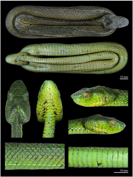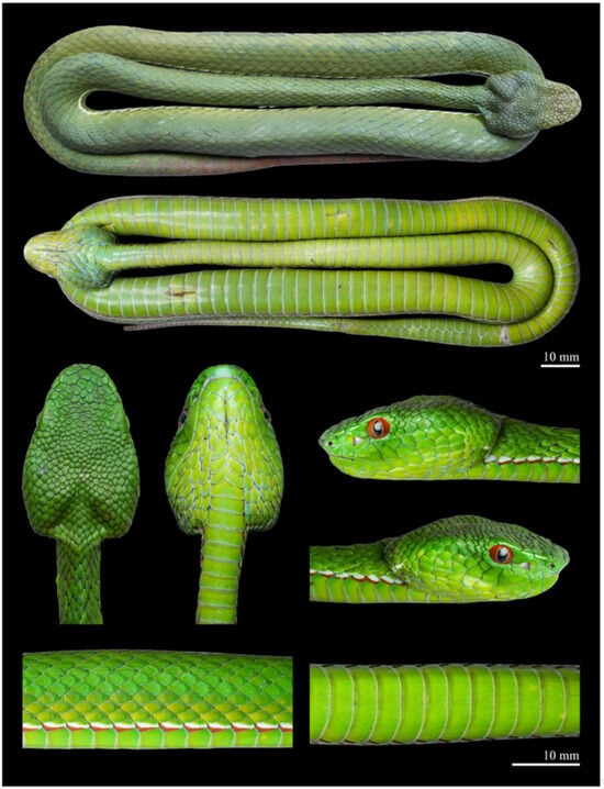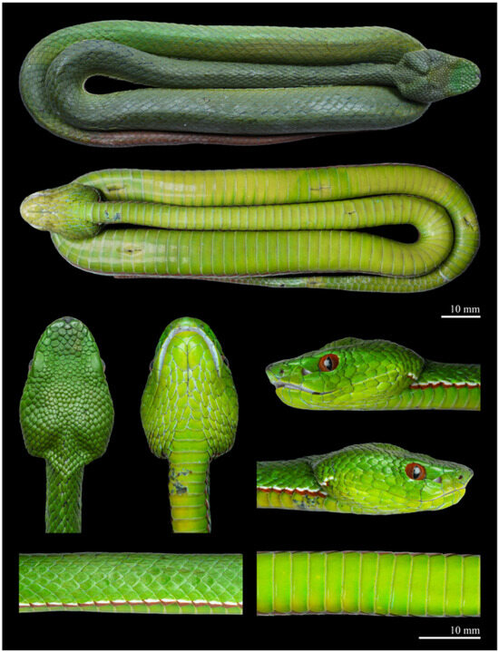 Fresh specimen of the holotype of Trimeresurus pretiosus sp. nov. (QHU 2025019, adult male). Photographs by Y.H. Xu. Scale bars = 10 mm.
