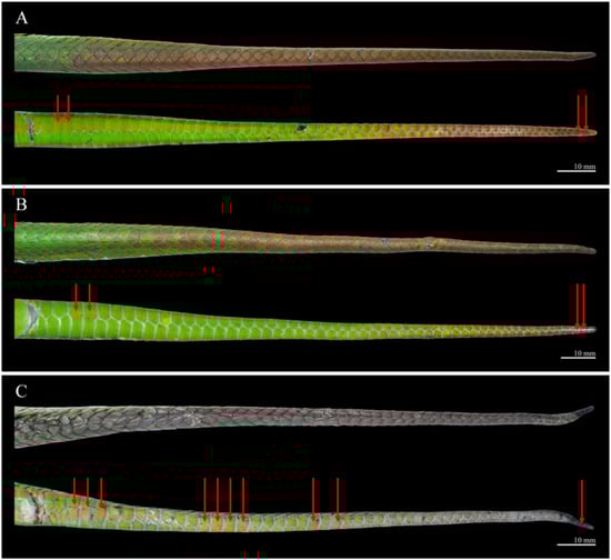 Dorsal and ventral views of the tail of Trimeresurus pretiosus sp. nov. Red arrows indicate the subcaudals in a single row. (A), QHU R2025019, holotype, adult male; (B), QHU R2025020, paratype, adult male; (C), QHU R2025021, paratype, adult female. Photographs by Y.H. Xu. Scale bars = 10 mm.