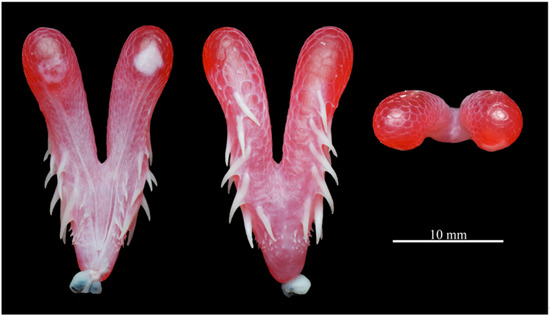 Hemipenis of the holotype of Trimeresurus pretiosus sp. nov. (QHU R2025019, adult male). Photographs by Y.H. Xu. Scale bar = 10 mm.