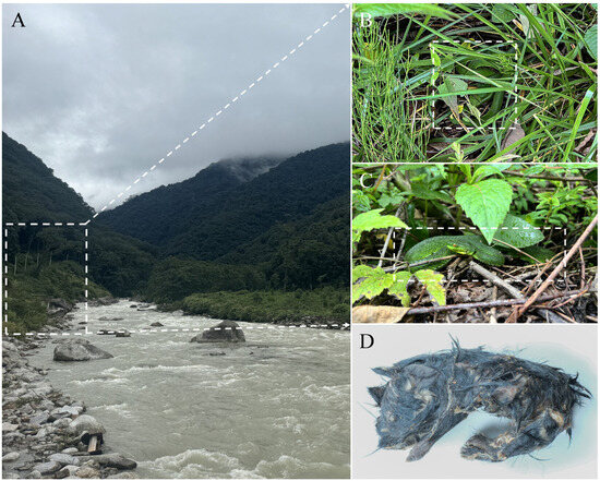 Distribution and natural history. Currently, Trimeresurus pretiosus sp. nov. is known only from Xiayadong Township, Yadong County, Xizang AR, China, where it inhabits moist broadleaf forests at an elevation of approximately 1824 m a.s.l. (Figure 9A). All specimens were encountered in the afternoon under clear to partly cloudy conditions. Field observations suggest that the species is predominantly terrestrial, as individuals were found either within grassy vegetation or near rocks surrounded by dense plant cover (Figure 9B,C), often in areas close to riverbanks. We speculate that the riverine environment provides higher humidity and relatively lush vegetation, which may offer suitable microhabitat conditions and sufficient shelter for the species. The female paratype (QHU R2025021) regurgitated a partially digested mouse shortly after capture, indicating that the new species, particularly females, may primarily feed on small mammals including rodents in the wild (Figure 9D). Given its proximity to the borders of Bhutan and India, it is plausible that the new species also occurs in suitable habitats across these regions, a possibility that warrants further field surveys.