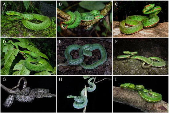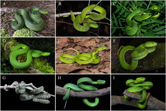 - Mirza, Z.A.; Lalremsanga, H.T.; Bhosale, H.; Gowande, G.; Patel, H.; Idiiatullina, S.S.; Poyarkov, N.A. Systematics of Trimeresurus popeiorum Smith, 1937 with a revised molecular phylogeny of Asian pit vipers of the genus Trimeresurus Lacépède, 1804 sensu lato. Evol. Syst. 2023, 7, 91–104. [Google Scholar] [CrossRef]