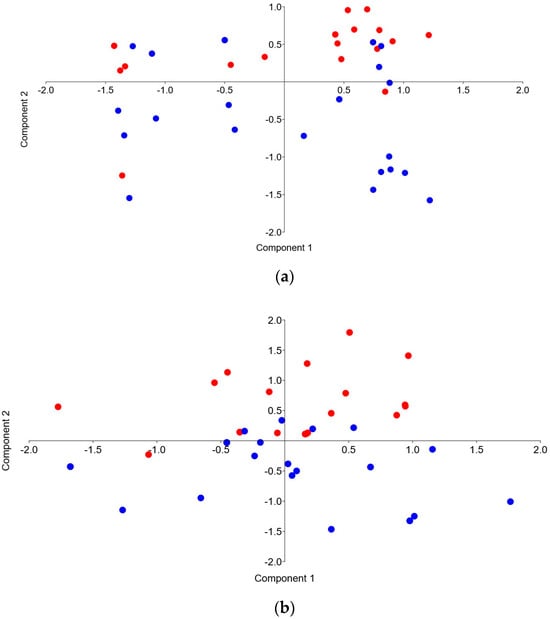 PCA analysis of the expression of all examined genes by strain during the winter (a) and summer (b) periods of the study. The two sheep strains are labeled with different colors: red—Hercegovačka strain of Pramenka; blue—Dubska strain of Pramenka.