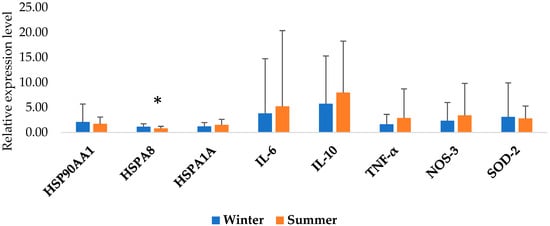 Relative gene expression in total samples between summer and winter periods. All values are presented as ± SD; * p < 0.05.