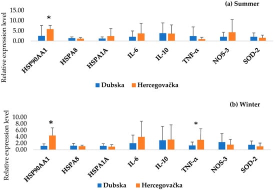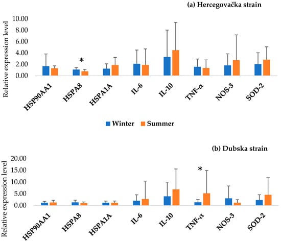 Relative gene expression in summer (a) and winter (b) periods between Dubska and Hercegovačka strains. All values are presented as ± SD; * p < 0.05.