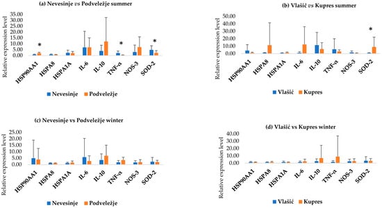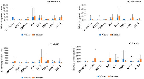 Relative gene expression in summer and winter periods in different research areas. All values are presented as ± SD; * p < 0.05.