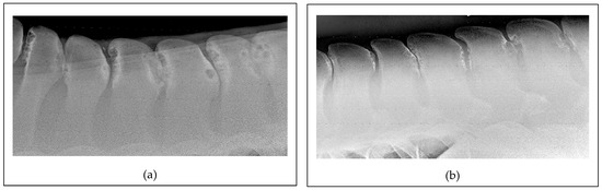 Lateral radiographic projections of the mid-thoracic area: (a) An image obtained for a 20-month-old Thoroughbred colt. Note the severe presence of narrowing, overriding, and kissing spine lesions between Th12 and Th17 with extensive osteolysis and sclerosis. The horse had never been ridden prior to the radiographic examination. (b) An image obtained for a 20-year-old Thoroughbred mare used for racing at the beginning of the life and then for pleasure riding and low-level show-jumping. In this case also, there is severe narrowing, overriding, and kissing spine lesions between Th15 and L3 with extensive osteolysis and sclerosis.