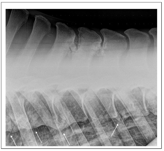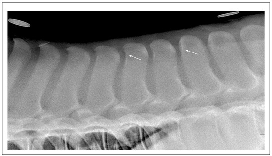 Lateral radiographic projection of the thoracolumbar junction in a 186-day-old Thoroughbred filly. There are linear small radiolucent areas surrounded by mild sclerosis (white arrows) of the cranial aspect of Th15 and T18.