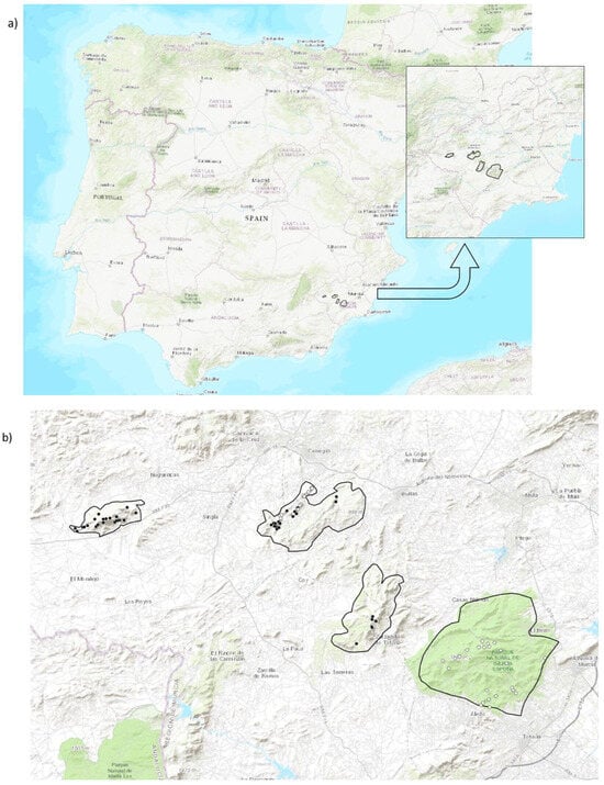 Delimitation of the study area. (a) Localization in Murcia province (inset image), southeastern Iberian Peninsula. (b) The four study areas and sampling points were ibex (black dots) and aoudad (white dots) feces were collected. Mountains from left to right: Mojantes/Caravaca (only ibexes), Burete/Quipar/Cabras and Cambrón (ibexes and aoudads), and Espuña (only aoudads). Basemap sources: © OpenStreetMap contributors (ODbL) and © Esri, accessed via QGIS 3.12.1.