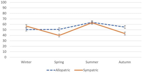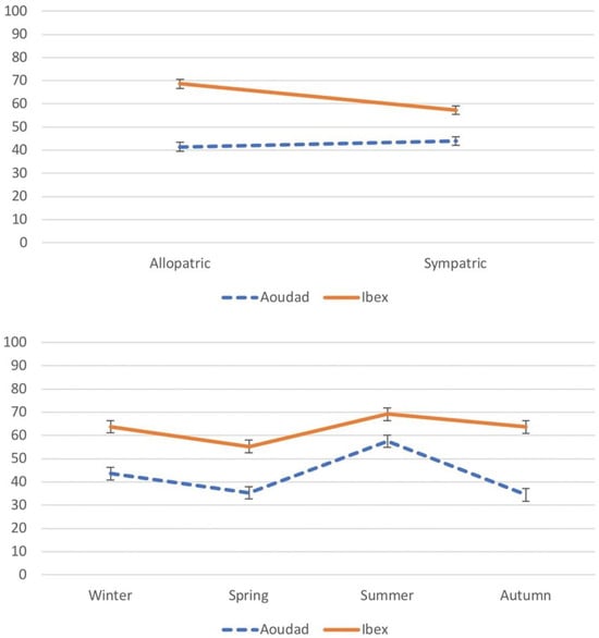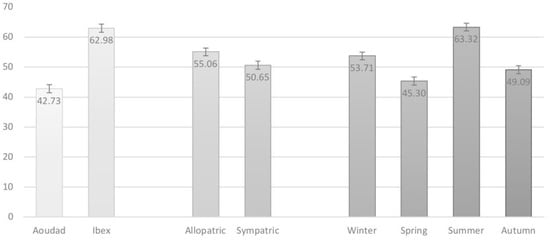 Figure 2 illustrates the main effects. The ibex consistently showed a higher proportion of woody plants in its diet (62.98%) compared with the aoudad (42.73%), supporting the strong species effect detected in Table 4. In terms of distribution, individuals in allopatry consumed more woody species (55.06%) than those in sympatry (50.65%). Seasonal differences were also evident: woody consumption peaked in summer (63.32%) and winter (53.71%), while spring (45.30%) and autumn (49.08%) showed lower values.