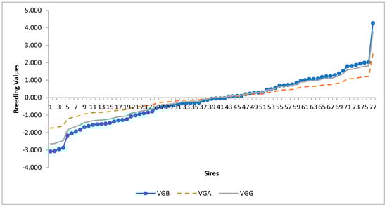 The additive genetic correlation of 0.61 + 0.001 between SD classes indicates that milk yield is a distinct trait with different levels of phenotypic variability [,,]. This finding underscores the presence of variance heterogeneity and emphasizes the impact of this heterogeneity on sire selection, thereby affecting the classification of individuals based on their phenotypic variability [,,].