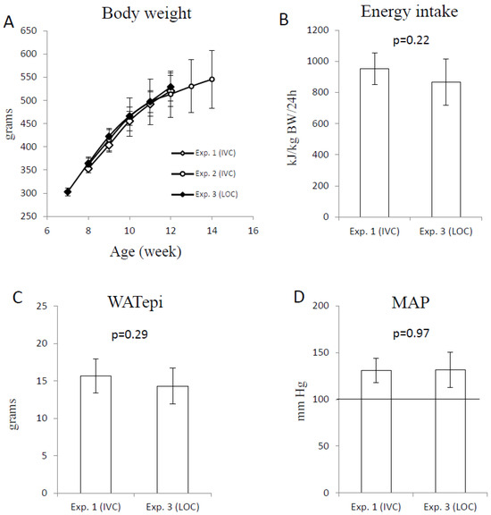 Body weight recorded weekly for Experiments 1 (IVC, N = 6), 2 (IVC, N = 6), and 3 (LOC, N = 10) (A), and daily energy intake (B), weight of WATepi (C), and MAP (D) for Experiments 1 and 3. Data are presented as the mean with standard deviation. The group’s bodyweight was compared using one-way ANOVA, and daily energy intake, WATepi weight, and MAP were compared using Student’s t-test, with the cut-off value for statistical significance set at a probability of 0.05. No differences were seen between the groups. The horizontal line in (D) represents the reference value for MAP in 12-week-old male lean Zucker fa/fa rats [8]. IVC; individually ventilated cages, LOC; large open cage, MAP; mean arterial blood pressure, WATepi; epididymal white adipose tissue.