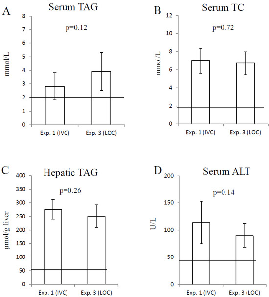The two groups of 12-week-old rats in Experiments 1 and 3, housed in an IVC and LOC, respectively, were also similar with regard to serum triacylglycerol concentration (Figure 3A), serum total cholesterol concentration (Figure 3B), hepatic triacylglycerol content (Figure 3C), and serum ALT concentration (Figure 3D).
