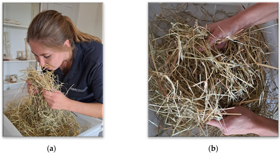 Illustration of sensory examination including odor, texture, color and impurities. (a) The examiner assessed the odor of the hay; (b) Hay color, and the presence of impurities were assessed visually, and haptic assessment (sense of touch) was used to evaluate texture.