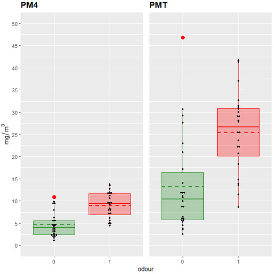 Box-and-whiskers plots of mean dust concentration (mg/m3) of particulate matter < 4 μm (PM4) and total particulate matter (PMT) in the Hay-Shaker by Odor (0: adequate (green boxes and lines); 1; abnormal (red boxes and lines); n = 50). Individual data points are shown in black, outliers are highlighted in red, and dashed lines indicate the group means.