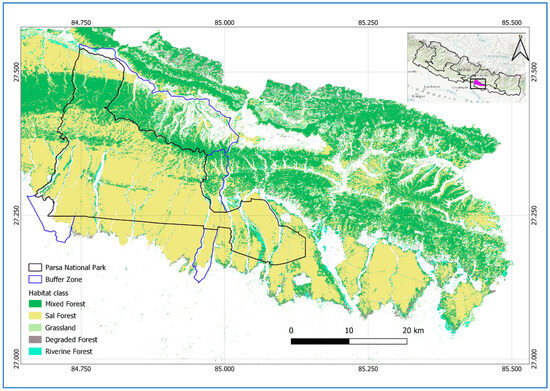 Location of study area: PNP (black solid line), its buffer zone (blue solid line), and national forests, Nepal. The forest area located to the south of PNP and its buffer zone boundaries, extending to the lower right side of the map, shows the national forests [45].