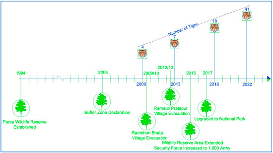 The study area encompasses 1758 km2 of Parsa National Park (PNP), its buffer zone, and national forests located in the Parsa, Bara, and Rautahat districts of Nepal (Figure 1). The entire area is a contiguous forest located in the easternmost part of the Terai Arc Landscape (TAL). The TAL is a transboundary region landscape, globally recognized for its commitment to conserving biodiversity and ecological integrity, while promoting the socio-economic well-being of local communities. The TAL is recognized as one of the world’s seven Restoration Flagships, highlighting its role as a leading model for sustainable landscape restoration by the United Nations [44]. Initially, PNP was designated as a wildlife reserve in 1984, comprising 499 km2 to protect wildlife such as tigers, but it was further extended by 127 km2 in 2015, and later upgraded to national park status in 2017. PNP is connected with Chitwan National Park, Nepal, to the west and the Valmiki Tiger Reserve, India, to the south. The 285.3 km2 buffer zone was declared in 2005, which surrounds PNP and includes forests, settlements, and agricultural land. The historical timeline, highlighting major events of PNP, is shown in Figure 2. Similarly, the national forests of the Parsa, Bara, and Rautahat districts, with a total area of 845.25 km2, are owned by the government, with the primary objective of forest utilization.