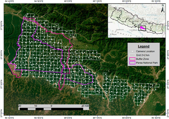 This study used camera trap data from Nepal’s national tiger surveys conducted in 2009, 2013, 2018, and 2022 (the latest), focusing on PNP, its buffer zone, and the adjoining national forests. The surveys were conducted each year during the winter–spring season (Dec–April) following the “Tiger and Prey Base Monitoring Protocol 2017” [50]. For the camera trap survey, the grid layout expanded from 117 (2 km × 2 km) in PNP in 2009 to 364 grids (Figure 3) up to the Rautahat district by 2022 (Table 2). In 2009, camera traps were placed only in PNP, but as evidence of tiger presence outside the national park increased, efforts were expanded in the buffer zone and adjoining national forests in subsequent years. The grids were established in the potential tiger habitats and consistently used for each census, with the exact location of camera trap station(s) on each grid chosen based on tiger signs such as pugmarks, scrapes, scat, water availability, and trails. At each station, a pair of cameras was mounted on trees or posts, at a height of 45 cm above the ground, facing each other at 6–8 m apart. The cameras were set to run for 24 h using white flash, and taking three pictures per trigger with no delay, for 16 days on average. Each camera and memory card was given a unique identification number for data recording and recognition, and the cameras were checked every two days to ensure continuous operation. The date, time, and camera ID were automatically printed on every image. Different types of cameras, including Reconyx (500 & 550), Bushnell Trophy Cam HD, Moultrie, Stealth, Cuddeback (C1), and Panthera (V5 &V6), were employed during this study. The position of each camera trapping station was systematically recorded using a handheld GPS device.