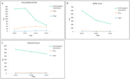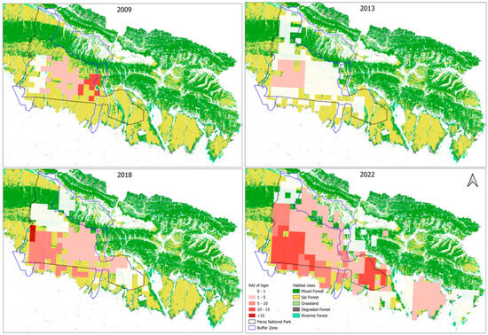 All details of the RAI values from 2009 to 2022 are given in Table 3. The visual display of the RAIs of tigers (Figure 4), prey species, and anthropogenic disturbances mapped against the habitat classifications of the TAL, as delineated by Thapa et al. [57], is provided in Supplementary Materials S2.
