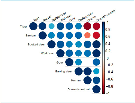 We treated anthropogenic disturbances (humans plus domestic animals) separately because changes in their abundance have an opposite relationship with wild animals [54,55]. We combined the RAIs of humans and domestic animals as anthropogenic disturbances, and the RAIs of all five prey species as prey, for the analysis of the line graph. To elucidate species relationships, we calculated the Spearman correlation coefficient (ρ) between the RAIs of tigers, prey species, humans, and domestic animals. Correlation coefficients between 0.5 and 0.7 indicated moderate relationships, where >0.7 indicated strong relationships [56]. The direction of the relationship (positive or negative) was determined by the sign of the coefficient. These graphs and correlations were used for testing the second hypothesis.