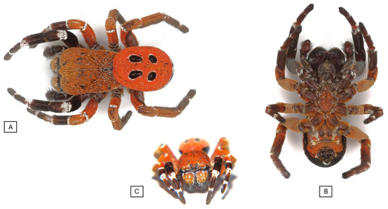 Habitus photo of the Eresus rubrocephalus sp. n. (A) Dorsal view, (B) ventral view, and (C) frontal view.