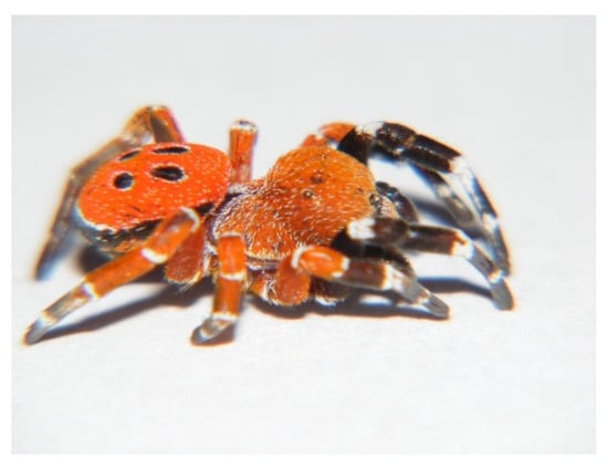 - Rezác, M.; Vanek, O.; Strestík, V. Eresus elhennawyi sp. n. (Araneae: Eresidae), a new velvet spider mimicking mutilid wasps from north-western Africa. Serket 2023, 19, 340–354. [Google Scholar]