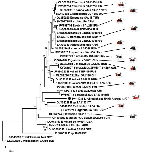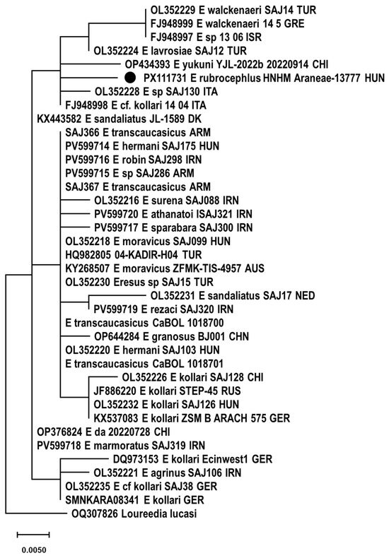 Unrooted maximum-likelihood phylogenetic tree of cox1 nucleotide sequences of Eresidae species. The tree was generated with the TN93+G+I model of the PhyML 3.0 software, with 1000 transfer bootstrap replicates. The sequence originating from the Eresus rubrocephalus sp. n. was labeled with a black circle.