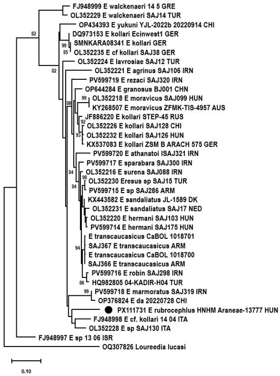 Maximum-likelihood phylogenetic tree of cox1 nucleotide sequences of Eresidae species, rooted to the cox1 nucleotide sequence of Loureedia lucasi. The tree was generated with the TN93+G+I model of the PhyML 3.0 software, with 1000 transfer bootstrap replicates. The sequence originating from the Eresus rubrocephalus sp. n. was labeled with a black circle.